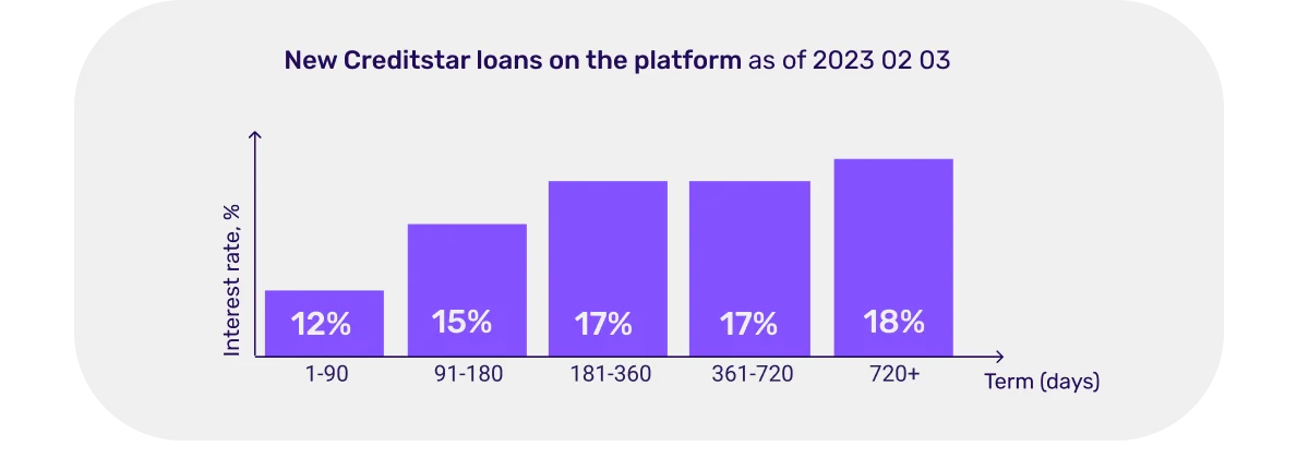 Moreover, with Lendermarket, the long-term loans offer, in general, a higher interest than short-term loans. With particular reference to new Creditstar loans on the platform (as of 2023 02 03), the interest rates are presented below: