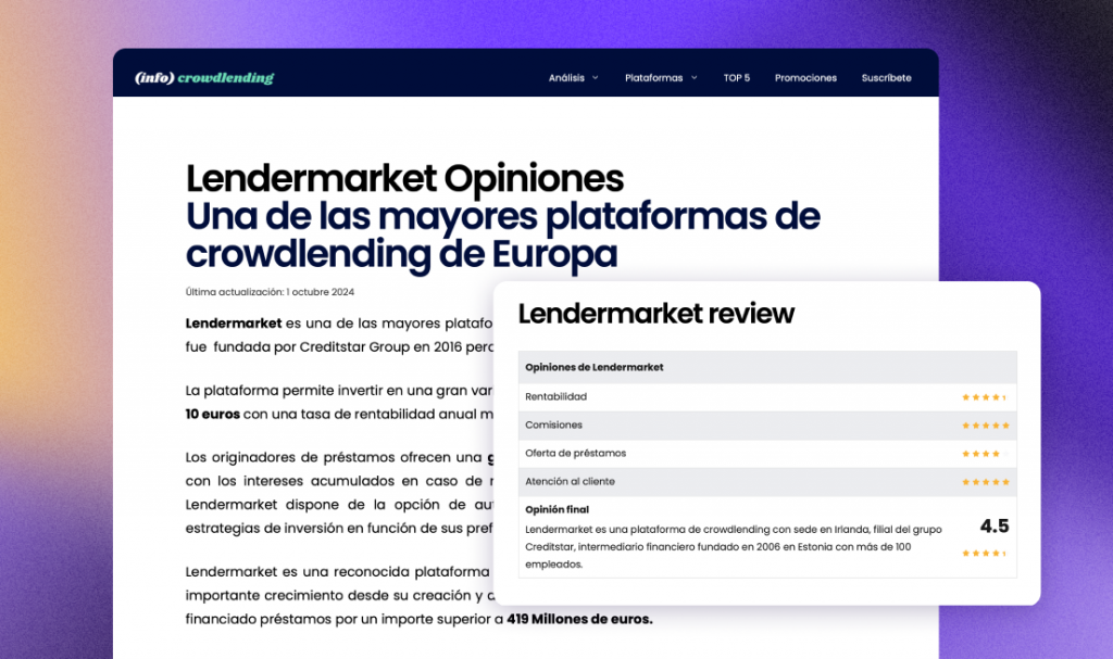 Lendermarket está diseñado para satisfacer las necesidades de los inversores en toda Europa. Cambia el idioma en la barra de navegación superior para acceder a contenido localizado, recursos y actualizaciones para tu región. ¡Invertir nunca ha sido tan fácil, estés donde estés!