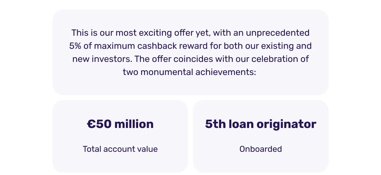 The continuous flow of investment capital now standing at €50 million from our investor community serves as the essential fuel powering these businesses, enabling them to expand, innovate and deliver quality credit products. But with the rising interest rates, there’s an increased risk of capital being diverted to traditional retail banking. By providing an attractive up to 5% cashback, we aim to maintain the steady flow of investment that these businesses need to thrive, while simultaneously offering our investors the opportunity to earn more from their investments.