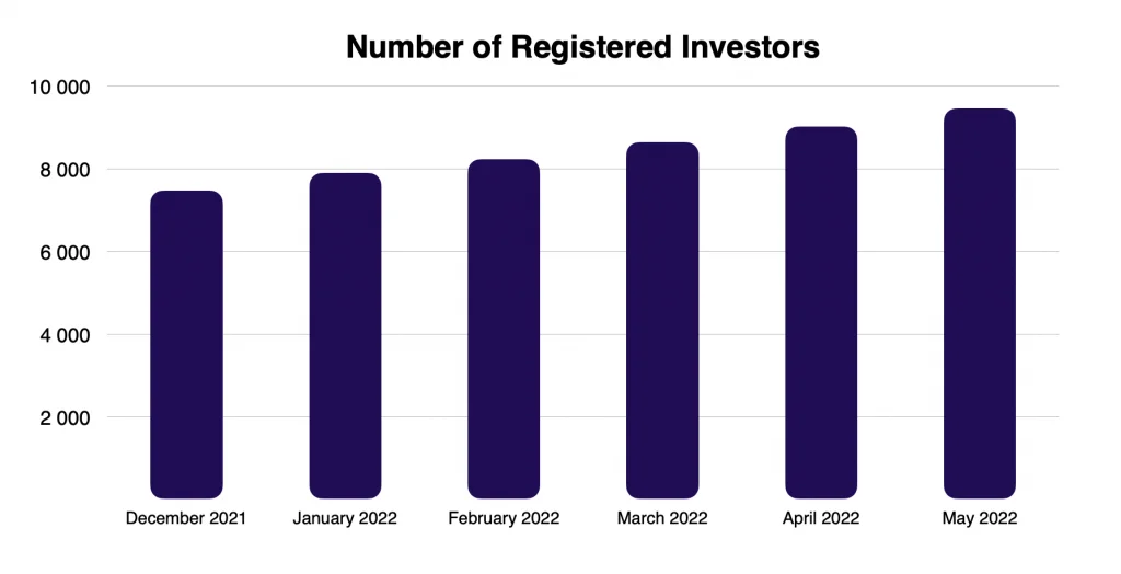 Number of investors equal users that currently have funds in their investment accounts. The number of investors has been growing steadily month by month.