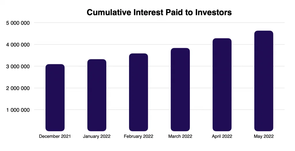 In the graph below we can see the amount of interest income earned by investors since Lendermarket started operations. The graph includes regular interest and delayed interest – interest received by investors when the loan is overdue.