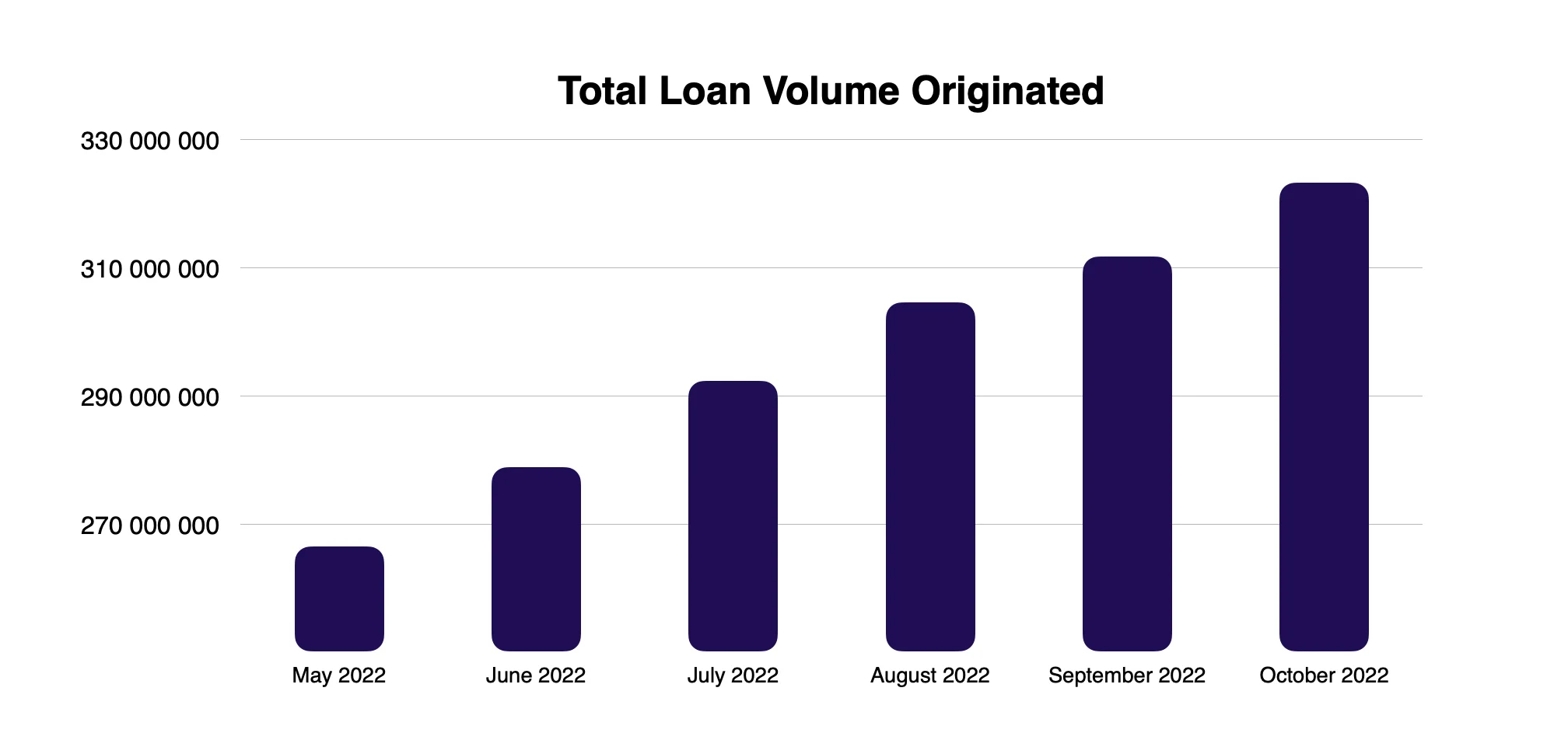 Total Loan Volume Originated shows the amount in euros that the loan originators made available to invest on Lendermarket. The graph below shows the cumulative loan volume originated in the last 6 months on the platform.