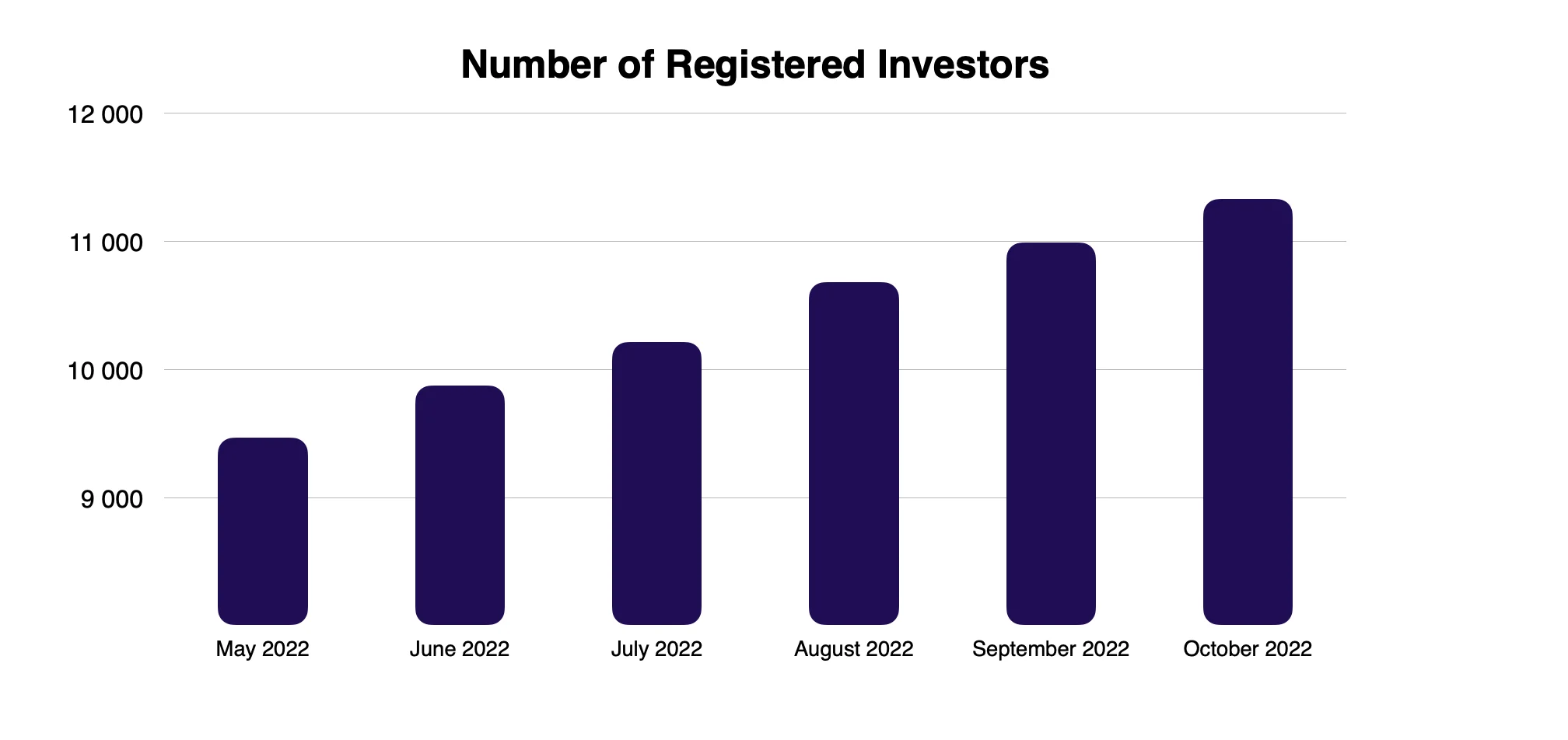 Number of investors equal users that currently have funds in their investment accounts. The number of investors has been growing steadily month by month.