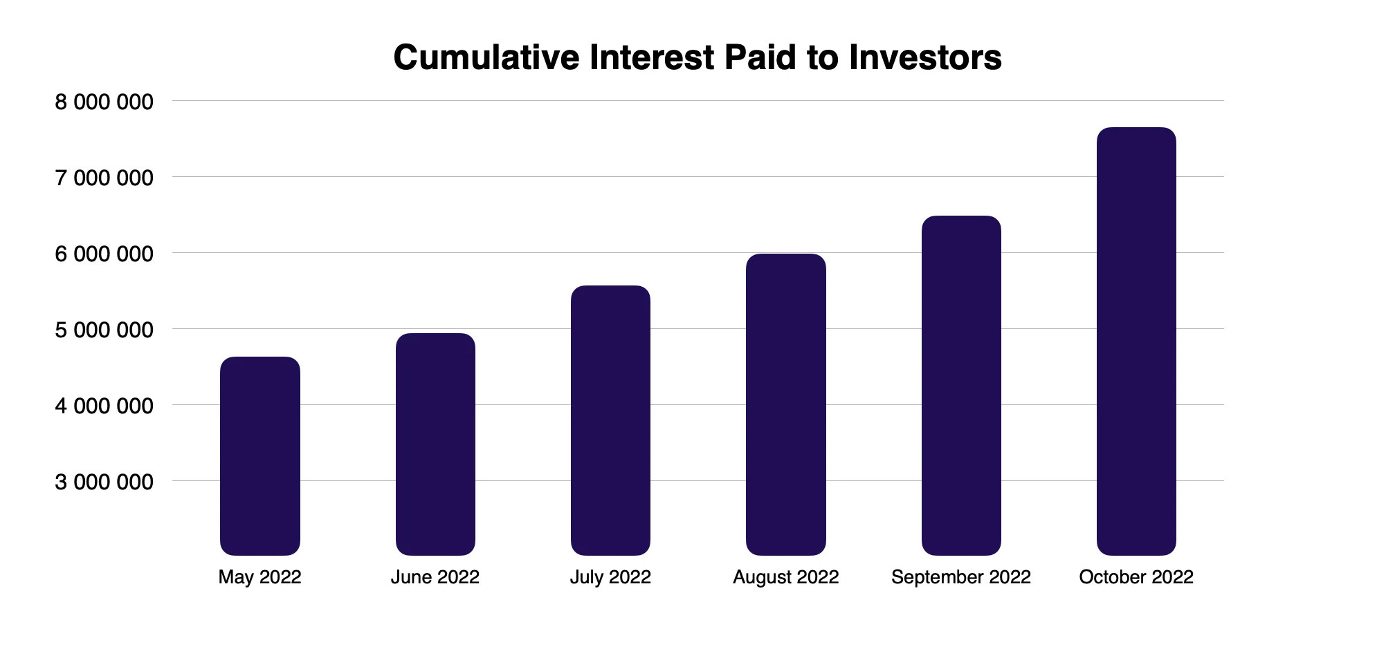 In the graph below we can see the amount of interest income earned by investors since Lendermarket started operations. The graph includes regular interest and delayed interest – interest received by investors when the loan is overdue.