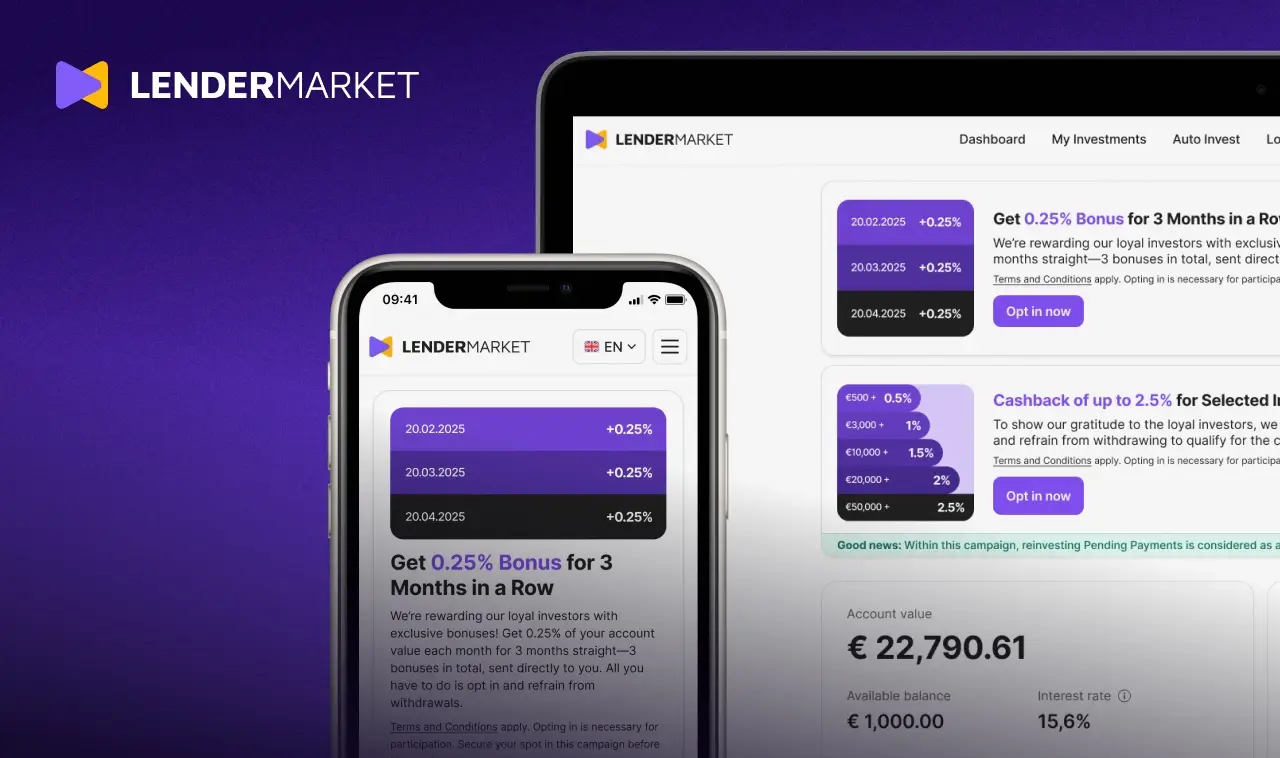 Receive a total of three monthly bonuses, each worth 0.25% of your account value. It’s our way of thanking you for being a valued Lendermarket community member. To qualify, simply opt-in and refrain from making withdrawals. Terms and Conditions apply.
