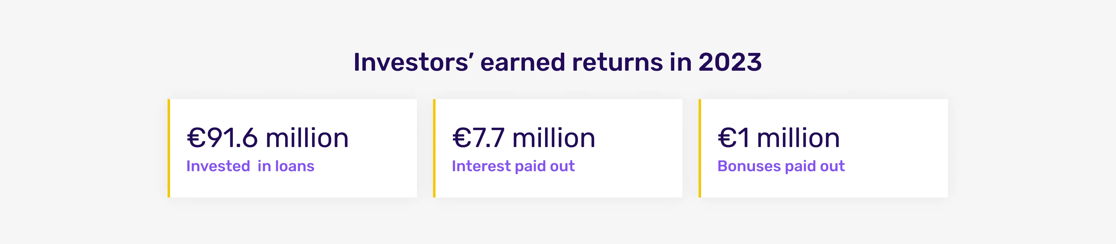 Throughout 2023, our investors invested a total of €91.6 million in loans and reaped the rewards, with Lendermarket paying out €7.7 million in interest over the year. Additionally, Lendermarket distributed an impressive amount of nearly €1 million in bonuses to investors partaking in exclusive offers throughout 2023 thus far. Notable that investors earned close to €30,000 in bonuses by inviting friends to join Lendermarket via the referrals program.