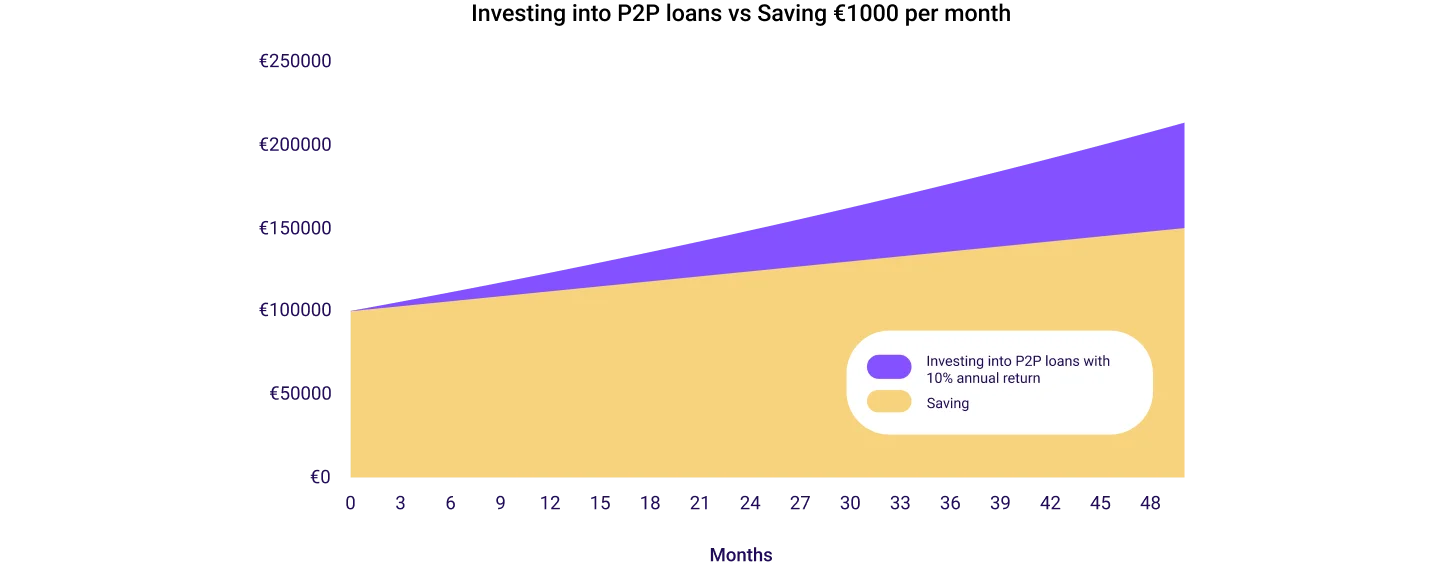 What would it look like if you invested your money into P2P loans with 10% interest? Then you would reach your goal after 25 months, so merely half the time.