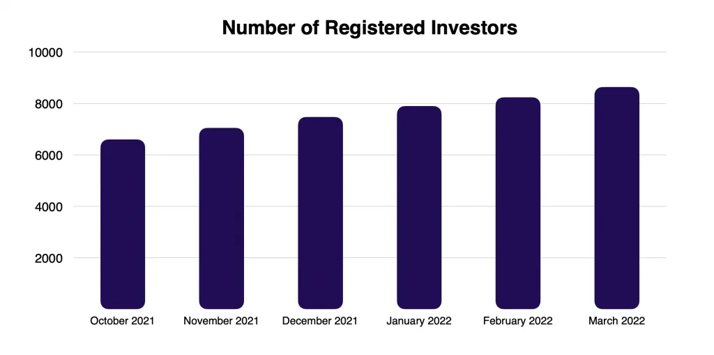 Number of investors equal users that currently have funds in their investment accounts. The number of investors has been growing steadily month by month.