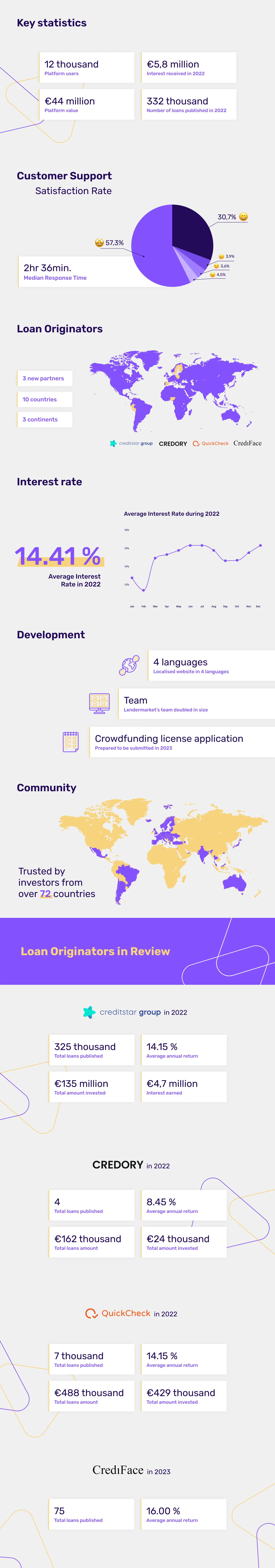 Let’s look back at the Lendermarket achievements in 2022 together. Thank you for being in our fantastic community! In this article, we will overview key statistics, satisfaction with customer support metrics, how many loan originators we welcomed this year, how interest rate changed during 2022, statistics for every loan originator, and many more. Hope you Enjoy reading!